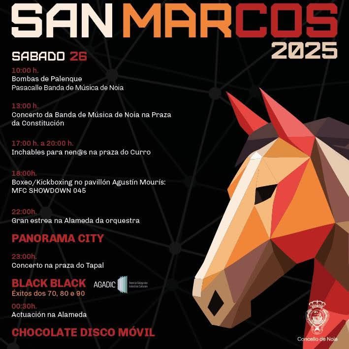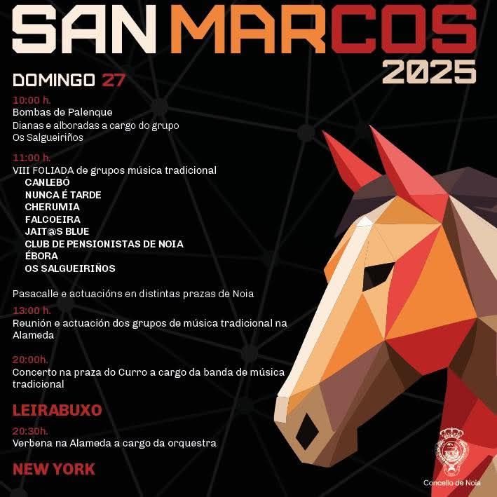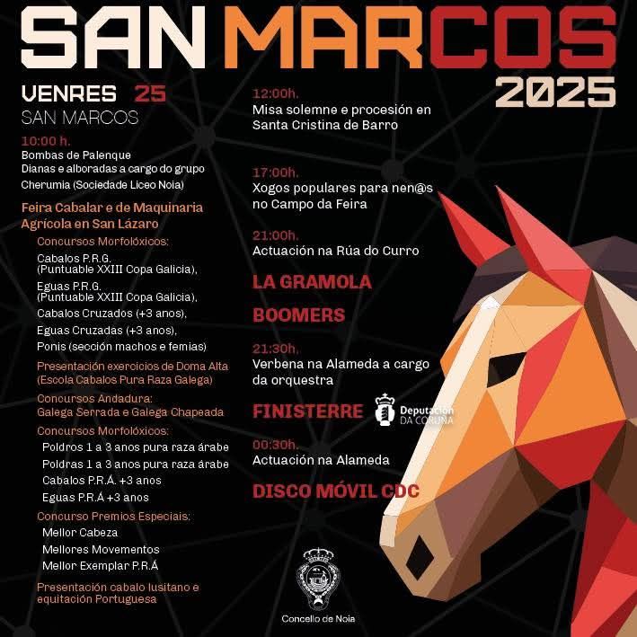 Noia, abril de 2025 – As Festas de San Marcos xa están ás portas, e Noia prepárase para vivir unha das citas máis queridas do seu calendario. Este ano, o programa mantén os piares clásicos da celebración: feira cabalar, música tradicional, actividades infantís e verbenas para todos os públicos. Iso si, sen grandes sorpresas nin nomes estrela, o cartel deste 2025 parece apostar pola prudencia e a continuidade.